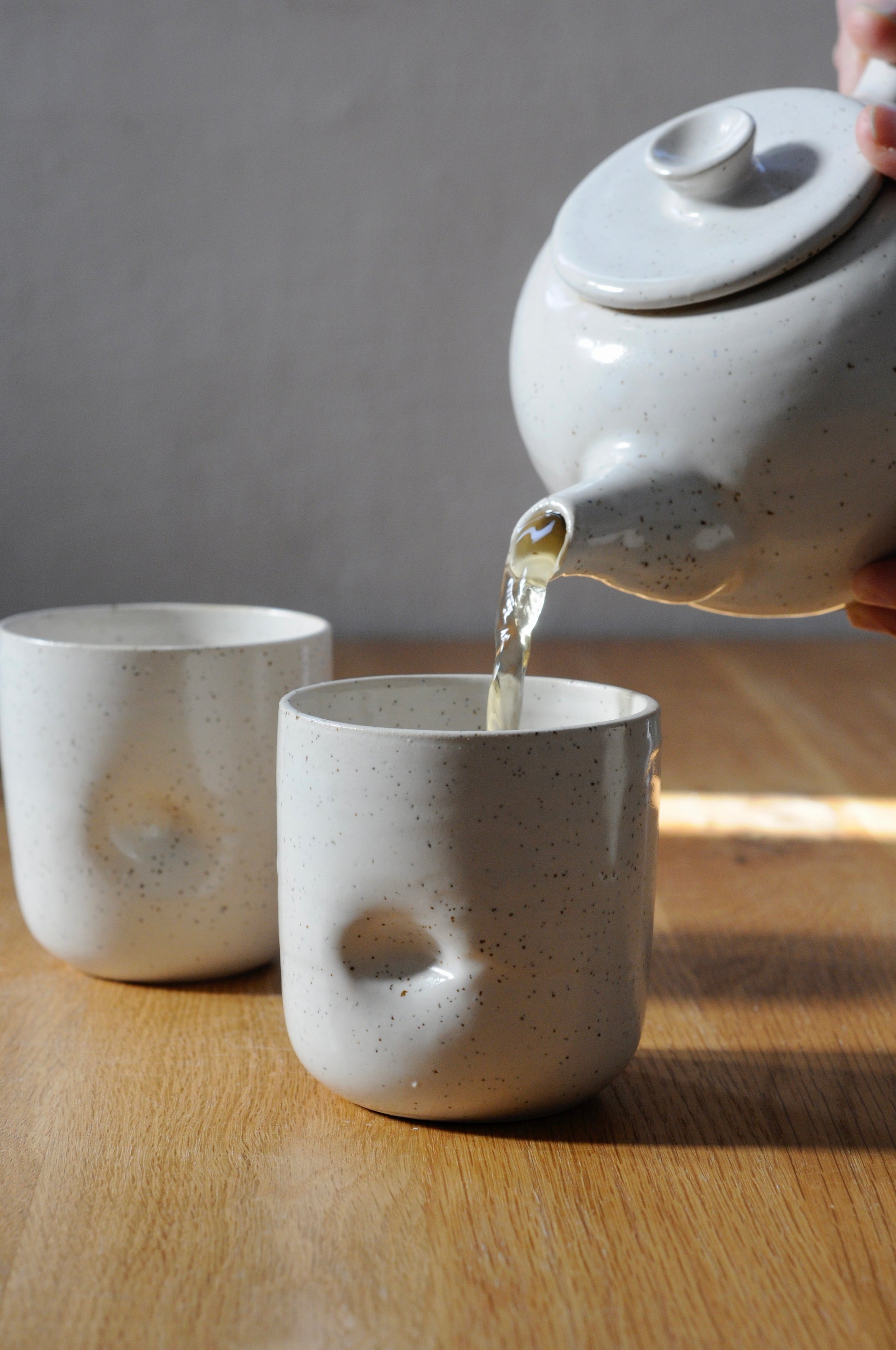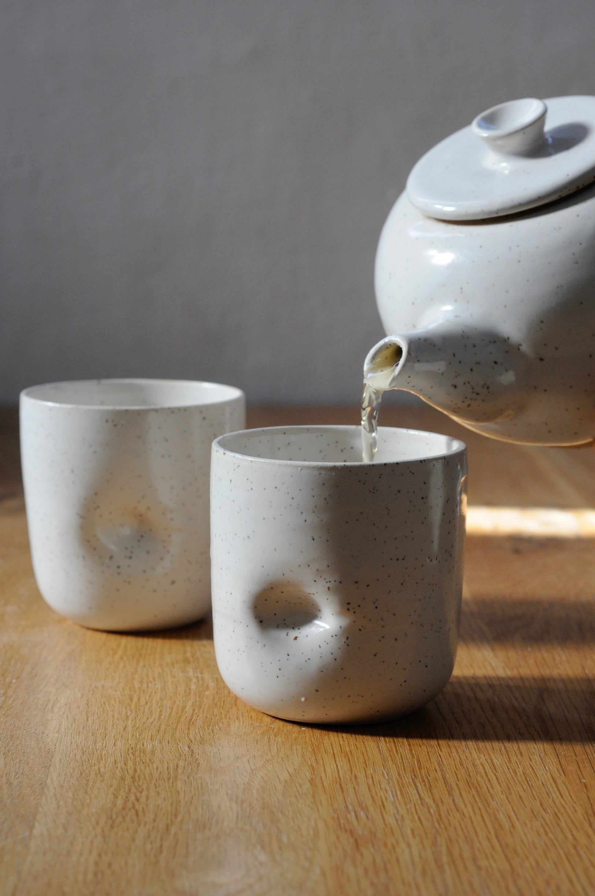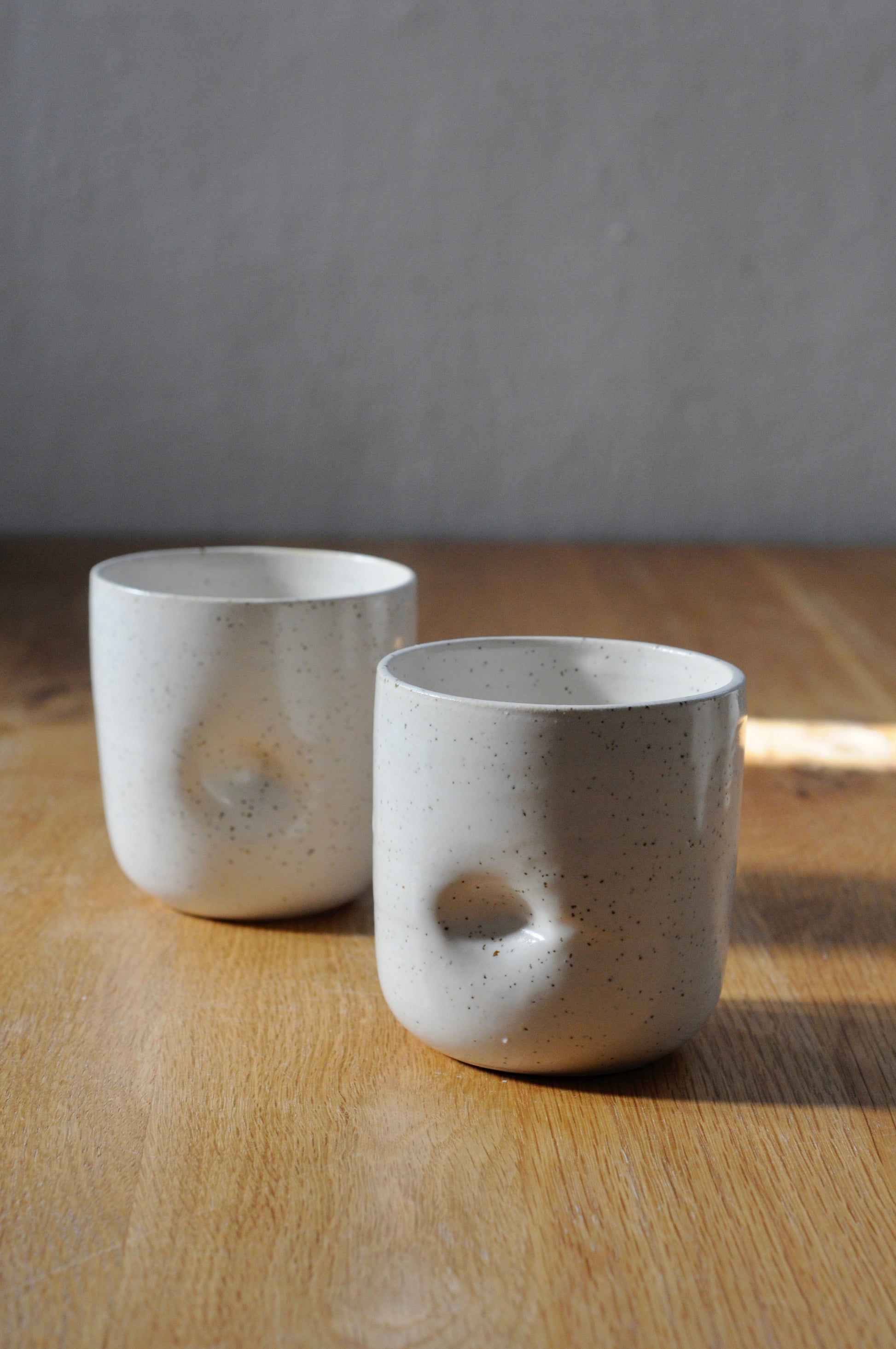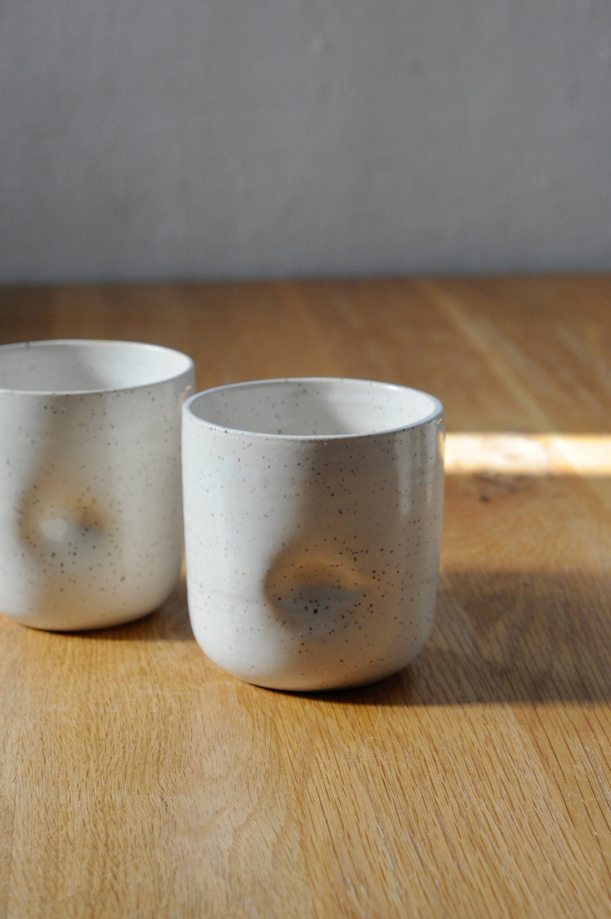 ספל עשוי חימר לבן עם חריץ לאצבע, מתאים למשקאות חמים וקרים.